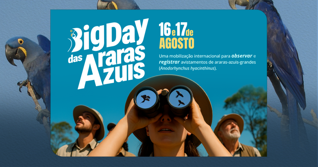 Nos dias 16 e 17 de agosto de 2025, o Instituto Arara Azul convida todas as pessoas no Brasil, Bolívia e Paraguai, a fazerem parte de uma grande mobilização: o primeiro Big Day das Araras Azuis – um chamado para a ciência cidadã. Este é um evento de participação aberta onde qualquer pessoa pode colaborar com a conservação da espécie.