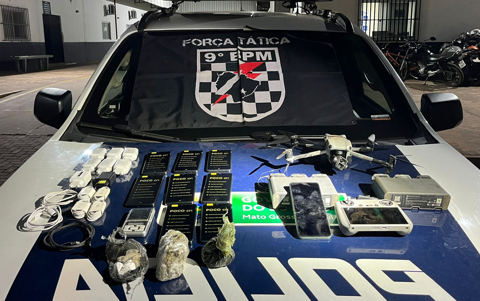 O flagrante ocorreu pouco depois da meia-noite, quando policiais da Força Tática do 9º Batalhão de Polícia Militar foram informados por agentes penitenciários sobre drones sobrevoando a penitenciária. A equipe iniciou buscas e conseguiu identificar o ponto de pouso do equipamento, próximo à BR-262, perto do posto Petromax.
