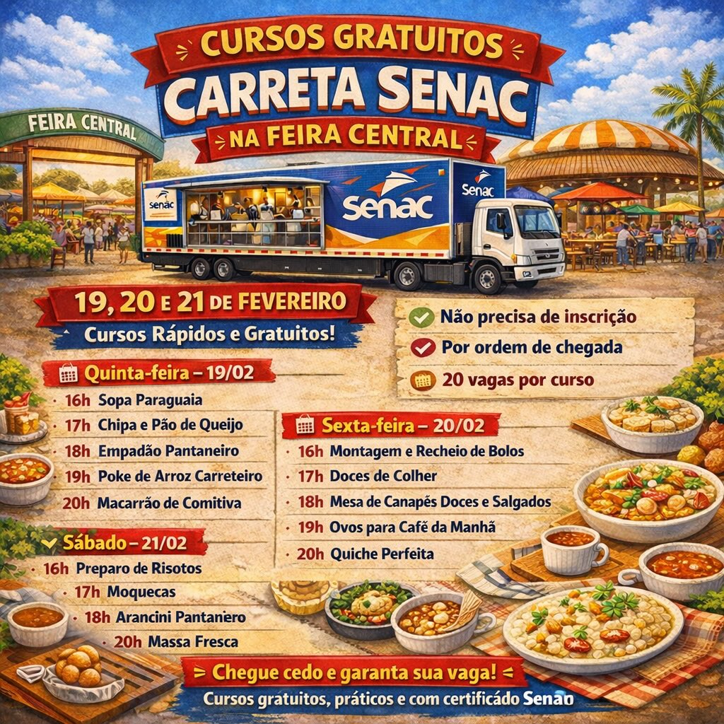 Panelas no fogo, receitas regionais no cardápio e certificado garantido ao fim da aula: é assim que começa, nesta quinta-feira (19), a programação da Carreta de Gastronomia do Senac em Campo Grande. A estrutura móvel estará estacionada na Feira Central de Campo Grande com cursos rápidos e gratuitos abertos à população.