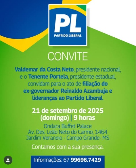 O ex-governador de Mato Grosso do Sul, Reinaldo Azambuja, oficializará sua filiação ao PL (Partido Liberal) no próximo domingo (21), em Campo Grande. O evento está marcado para as 9h, no Ondara Buffet Palace, localizado na Avenida Desembargador Leão Neto do Carmo, 1464, no bairro Jardim Veraneio.