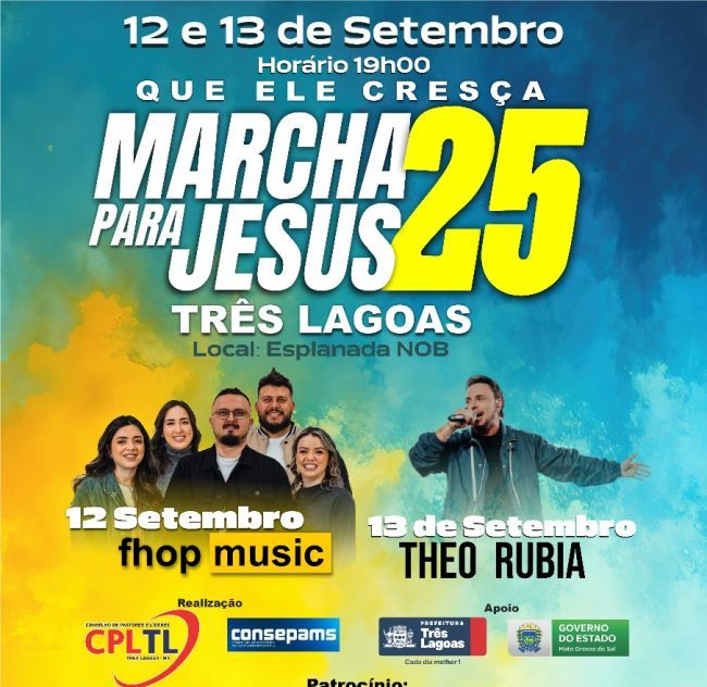 A cidade de Três Lagoas se prepara para viver um grande momento de fé e união. Nos dias 12 e 13 de setembro, será realizada a 7ª edição da Marcha para Jesus, com o tema “Que Ele Cresça”, reunindo a comunidade cristã para uma programação de louvor e confraternização.